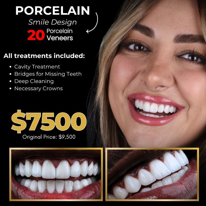 In Miami, the cost for 20 porcelain veneers alone ranges from $7,000 to $9,000. This price does not include additional treatments such as deep cleaning or cavity fillings. At our clinic, we offer a comprehensive package price for the entire porcelain veneer design.